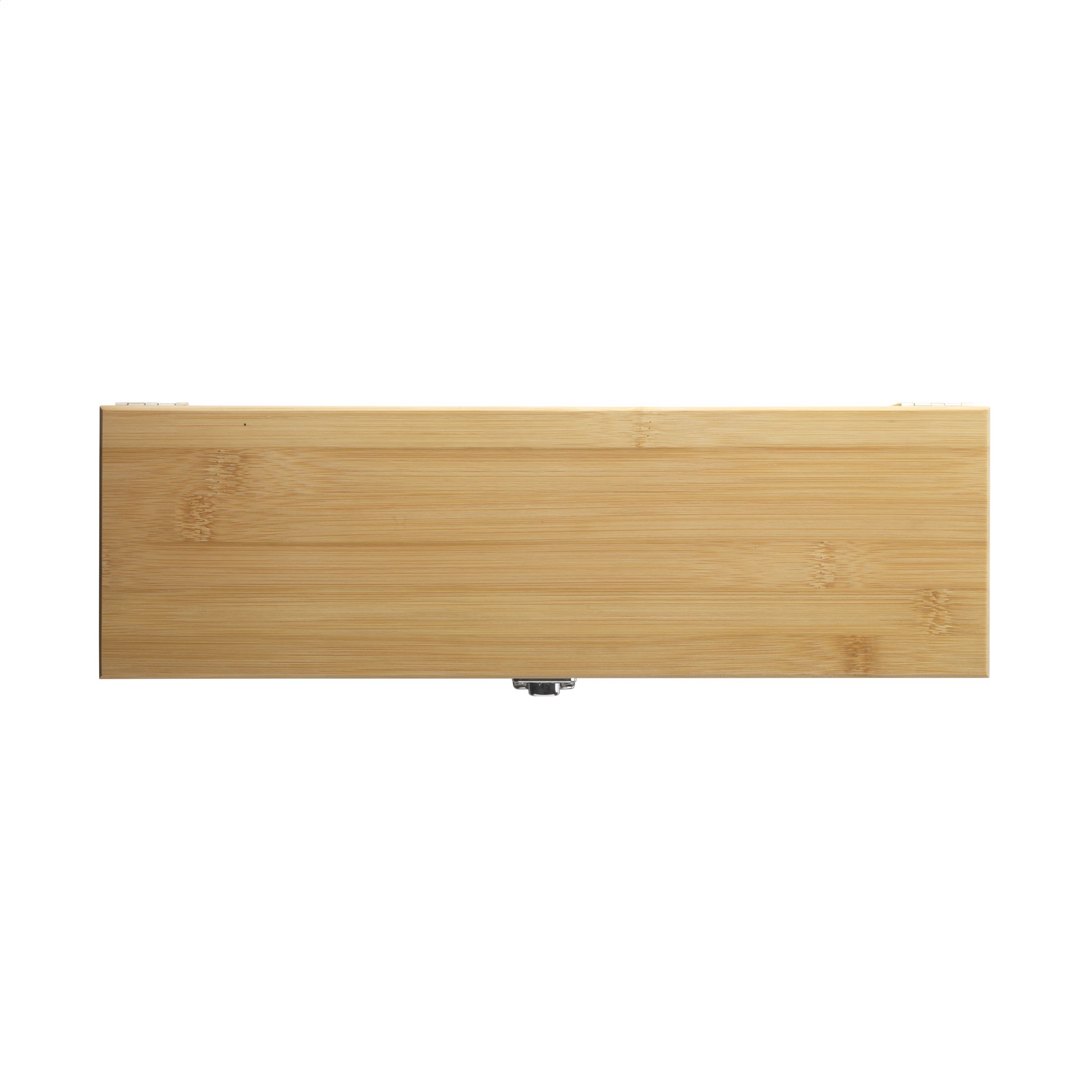 Luxury wine box made of high-quality bamboo. With drop catcher, bottle stopper and stainless steel waiter’s knife. Excl. wine. Each set in a box.