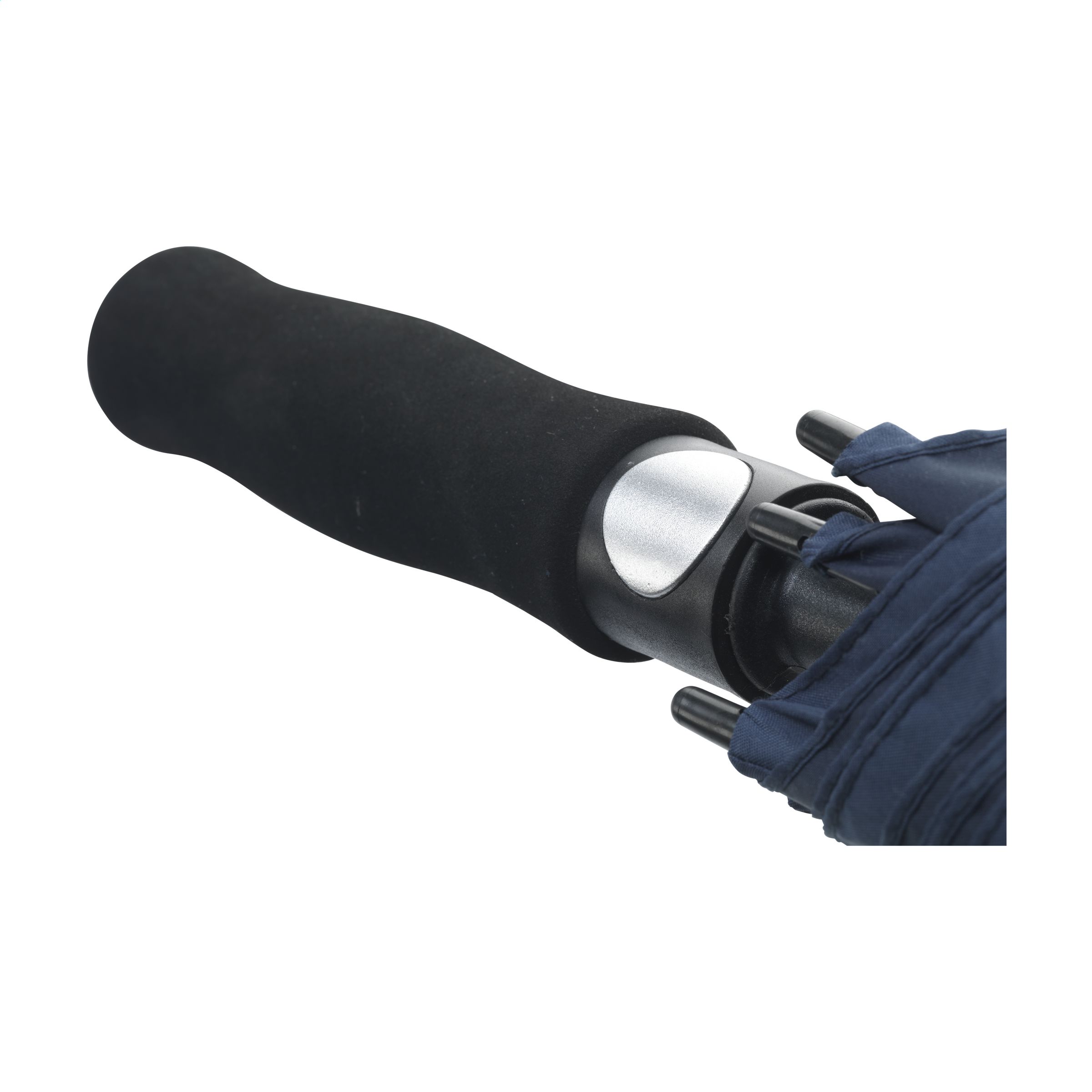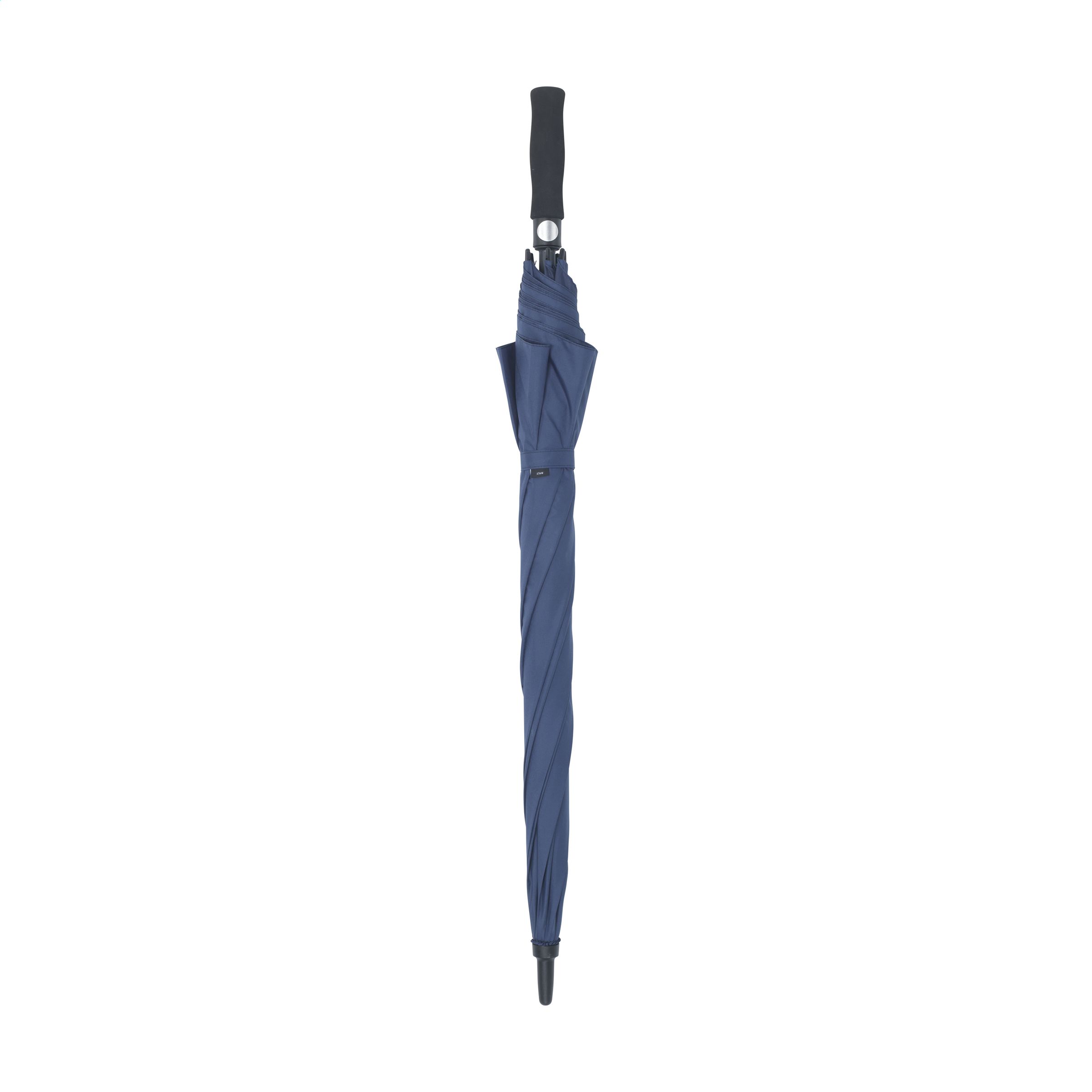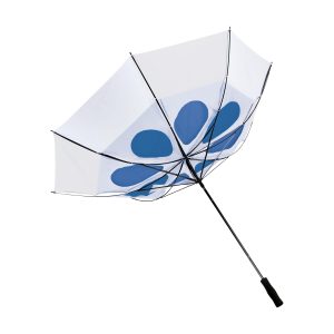 190T RPET pongee umbrella (made from recycled PET bottles) with an extra-large diameter of 132 cm (30 inches). Features include automatic telescopic suspension for ease of opening, fiberglass frame and stem, soft foam handle, velcro closure and water repellent.