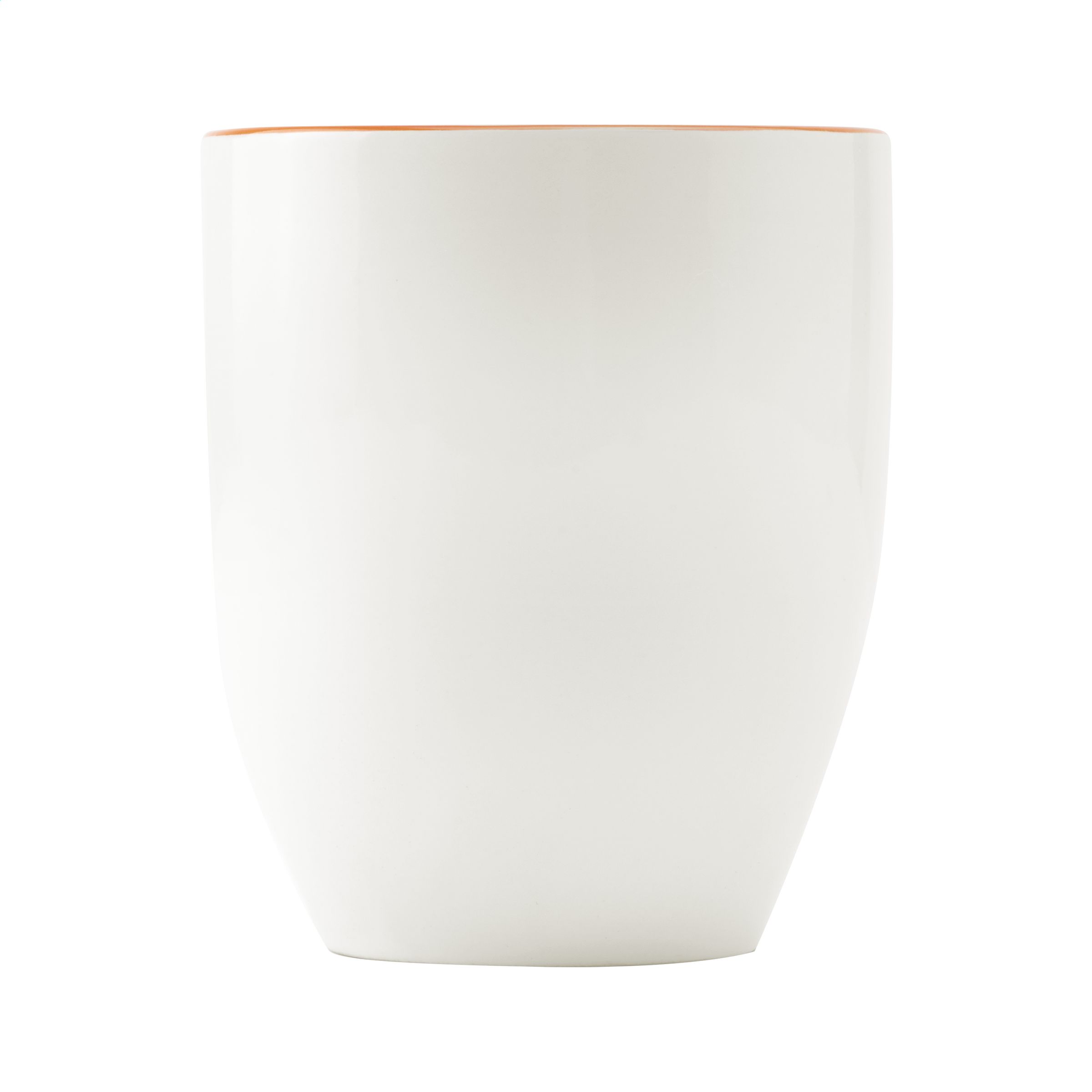 Extra large ceramic mug. Available in pure white or with an eye-catching coloured interior. Capacity 450 ml. Dishwasher safe. The imprint is dishwasher tested and certified: EN 12875-2.