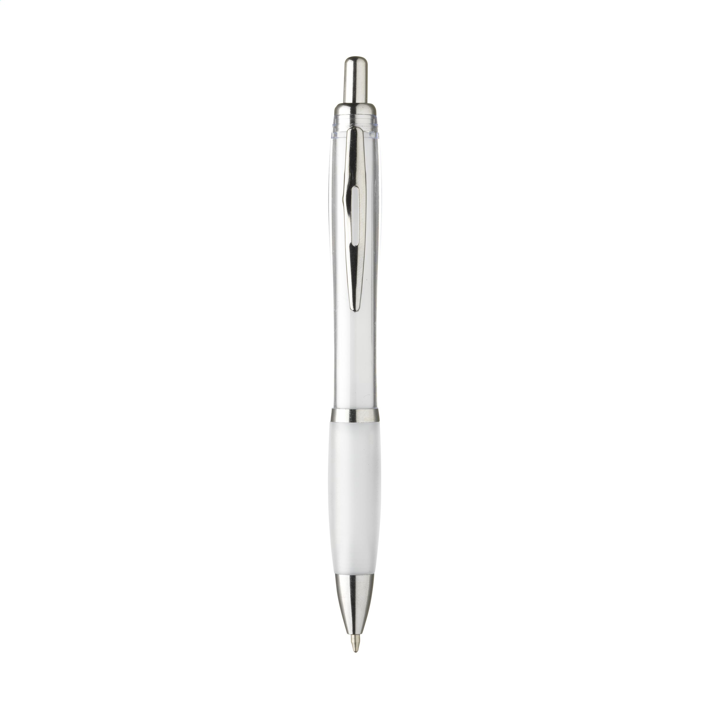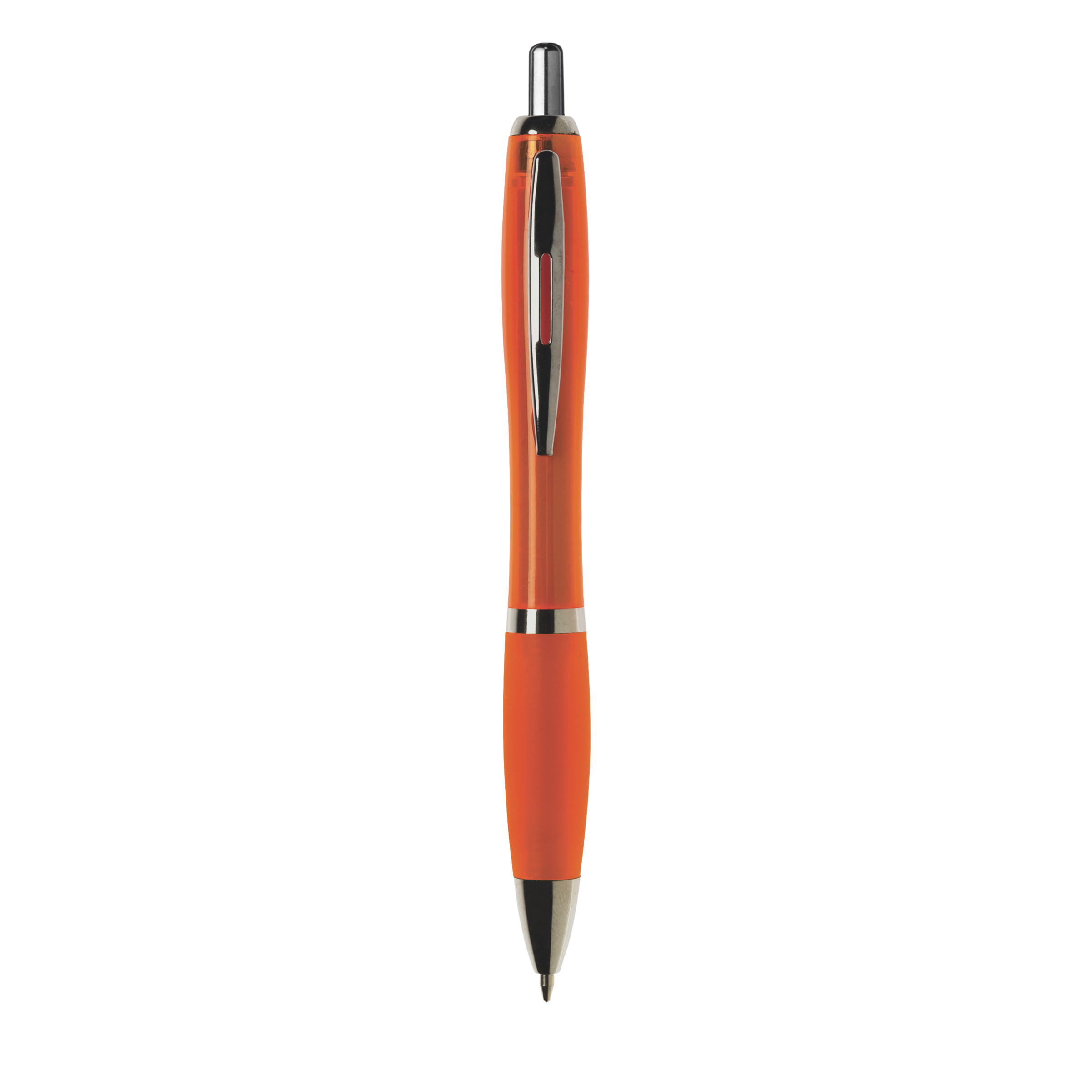 Blue or black ink ballpoint pen with a transparent colored barrel, non-slip grip, and metal clip.