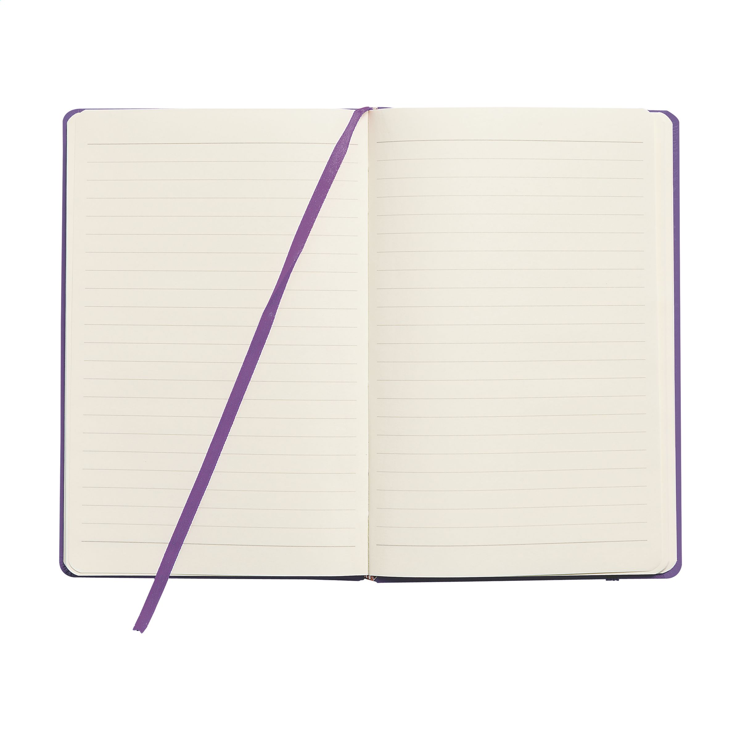 Notebook in A5 format with 96 pages cream coloured, lined paper (80 g/m²). With a perfect binding, hard cover, pocket, elastic fastener and silk ribbon.